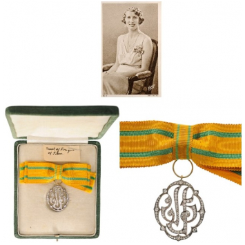 A First Class Breast Badge (BE2469-2478 or 1926-35 A.D.), in the form of the Royal cypher in Gold, profusely set with Diamonds; small suspension loop and round, ribbon-ring; with original, ladies’ bow ribbon; in the original, morocco case of issue, with fitted, velvet lined inner compartment with a handwritten note, pinned to the inner cushion; together, a portrait photograph of the Crown Princess of Denmark, wearing the badge.