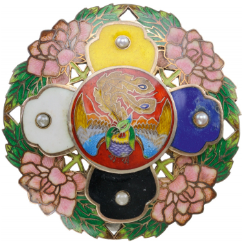 Gilt Silver, with 4 pink enameled roses sided by green leaves, with overlying “cross”, the arms enameled in yellow, blue, black and white resp. and centered by a pearl each; fire-red enameled centre medallion with polychrome enameled mythological bird; concave reverse, with vertical, tapering pin. A very rare decoration awarded to ladies only, excellent condition.