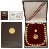 A 1st Class Collar Set of the 2nd type, as awarded to foreign dignitaries, with the rank of ministers upwards, belonged to Armeegeneral Heinz Kessler, former Minister of Defense of the German Democratic Republic: collar chain in gilt silver composed of 16 oval medallions bearing the coat of arms of North Korea, 17 round medallions with waving borders, centered by a stylized flower, all connected by triple segments of chain; a larger, separate link in the form of North Korea’s coat of arms, fitted with ring and hook to mount it to the collar chain and to which to append the Order’s Badge made of gilt Silver in the form of a reversed, five-pointed beaming star, each tip, with triple ball-finial, flanked by polished beams; the centre bearing a five pointed star, within enameled border with the colours of the Korean flag; the reverse, fitted with a hook pointing downwards and raised Korean inscription with the indication of the class “1”; in the original case of issue with fitted inner compartment and Korean coat of arms in gilt metal to the outer lid; with the original award document dated July 14th, 1988 (decision of the Central Committee, in the name of Comrade Kim Il-Sung) and the date of the award, on July 15th; in the original, dark brown leather folder.