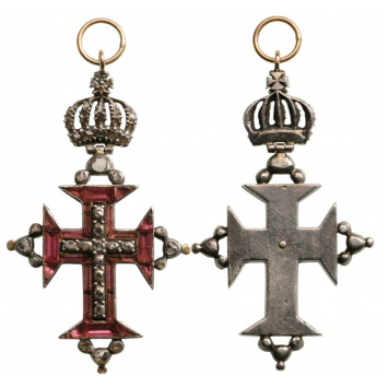 A jewelled decoration of reduced size: the order’s cross, completely set with rose-red stones, centered by a latin cross, set with Diamonds; the border of each arm, enriched by 3 diamonds; hinged upper crown, profusely set with diamonds; suspension ring in gold; smooth reverse, with one centre rivet.