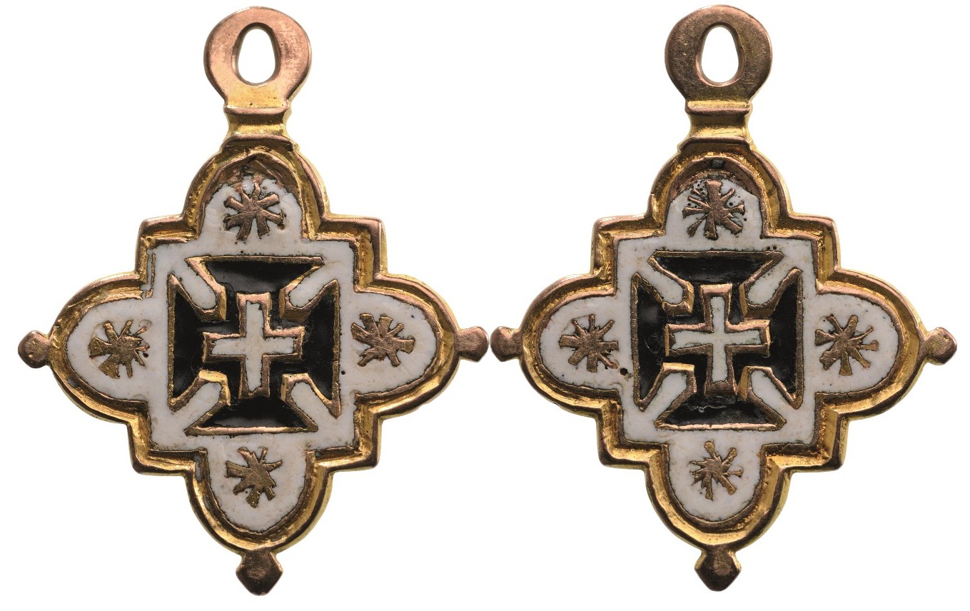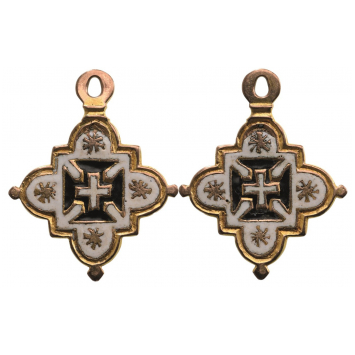 An early decoration of reduced size in Gold; both sides with white enameled field enriched with tiny rosettes, centered with the Order’s cross in green and white enamel; upper loop for suspension.