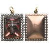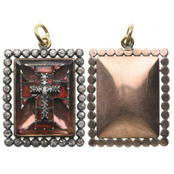 A jewelled badge of the order of an uncommon form: rectangular medallion in Gold, set with a faceted stone superimposed with the cross of the order, completely set with red stones, centered by a cross set with diamonds, the whole, within a frame of brilliants; convex, polished reverse; on top, round loop and suspension ring.