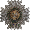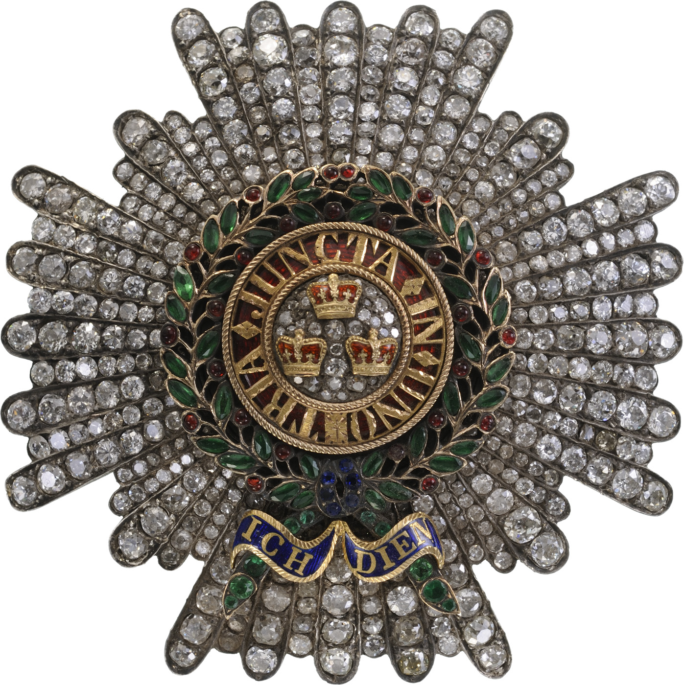 A Jewelled Commander’s Breast Star of the Military Division: with chiseled silver rays, completely set with Diamonds of different sizes; centre medallion, also set with diamonds, with superimposed, three royal crowns in gold and red enamel; gold bordered, red enameled outer circlet, with applied motto of the Order in chiseled gold; all surrounded by a golden laurel wreath set with emeralds to imitate the foliage and rubies representing (right below the tying knot, set with deep-blue stones, these, above the golden, deep-blue enameled scroll with the motto “ICH DIEN”); the reverse with a plate and centre convex disc made of gold, fitted with a vertical pin, also made of gold.