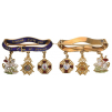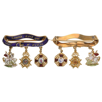 An outstanding miniature bar: blue enameled scroll in the form of a closed, golden “Garter” with buckle, bearing the Order’s motto “HONNI SOIT QUI MAL Y PENSE” in golden, gothic lettering, to which are appended the miniatures of the St. George in gold, enriched by excellent, poly-chrome, miniature enamelwork, giving the piece with excellent detail; the badge of the Hanoverian Guelphic Order with Swords in Gold, with excellently-made, enameled centre medallion and the miniature of the Imperial Russian Order of St. Anne, also in Gold, with red enameled arms and excellently painted, obverse and reverse centre medallions; suspension bar with horizontal, golden pin to the reverse.