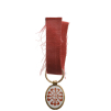 A miniature of the Order in Gold, of oval form, white enameled, obverse bearing the Order’s cross of translucent, red enamel, chiseled, golden border; concave, polished border; with cylindical suspension loop and round, ribbon ring.