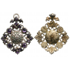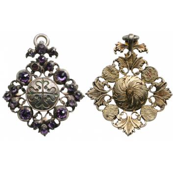 An early, jewelled cross of the Order: convex, Silver round medallion with traces of gilding, with the order’s cross (remains of the original enamel), within a richly chiseled frame of rocailles and branches, set with amethysts; richly engraved gold reverse with a tiny nut retaining the obverse centre; upper hook and tiny, round, suspension ring.