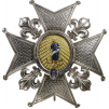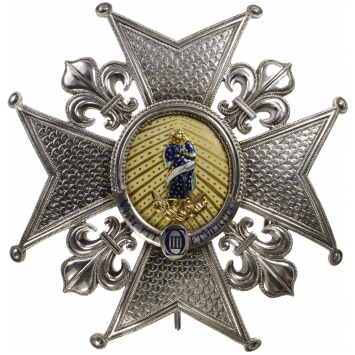 An early Grand Cross Breast Star of large size, from the last years of 18th or the earliest 19th Century; the silver cross’s arms, made to imitate the sequined embroidery, flanked by fleurs-de-lys; oval, yellow enameled centre medallion, with painted golden beams, superimposed by the polychrome enameled image of the Holy Virgin, made of gold, with most finely chiseled details; silver, grooved and roped outer circlet, with the motto “VIRTUTI ET MERITO” in blue enameled lettering and, a central oval, with blue enameled “ciii” monogram; smooth, polished reverse with concave counter-medallion, fitted with vertical, broad pin and two side-hooks.