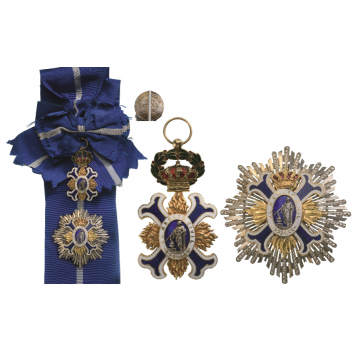 A Grand Cross Set of the first model: Sash Badge in Gold with white bordered, deep sea-blue enameled arms, flanked by chiseled, golden flames; blue enameled, oval centre medallion with allegoric image made of toned silver, within white enameled outer circlet, bearing the Order’s motto; the upper “flame” with hinged royal crown enriched by red enameled inner cap, resting on green enameled laurel wreath; sphaerical loop and round ring; with original, silk sash ribbon; Breast Star with chiseled and polished rays; the centre made of gold, en-suite with the sash badge, also with finely chiseled/polished golden flames, royal crown between the centre’s upper arms, with red enameled inner details; polished reverse, bearing the maker’s escutcheon of Medina, Barcelona and Madrid; vertical pin.