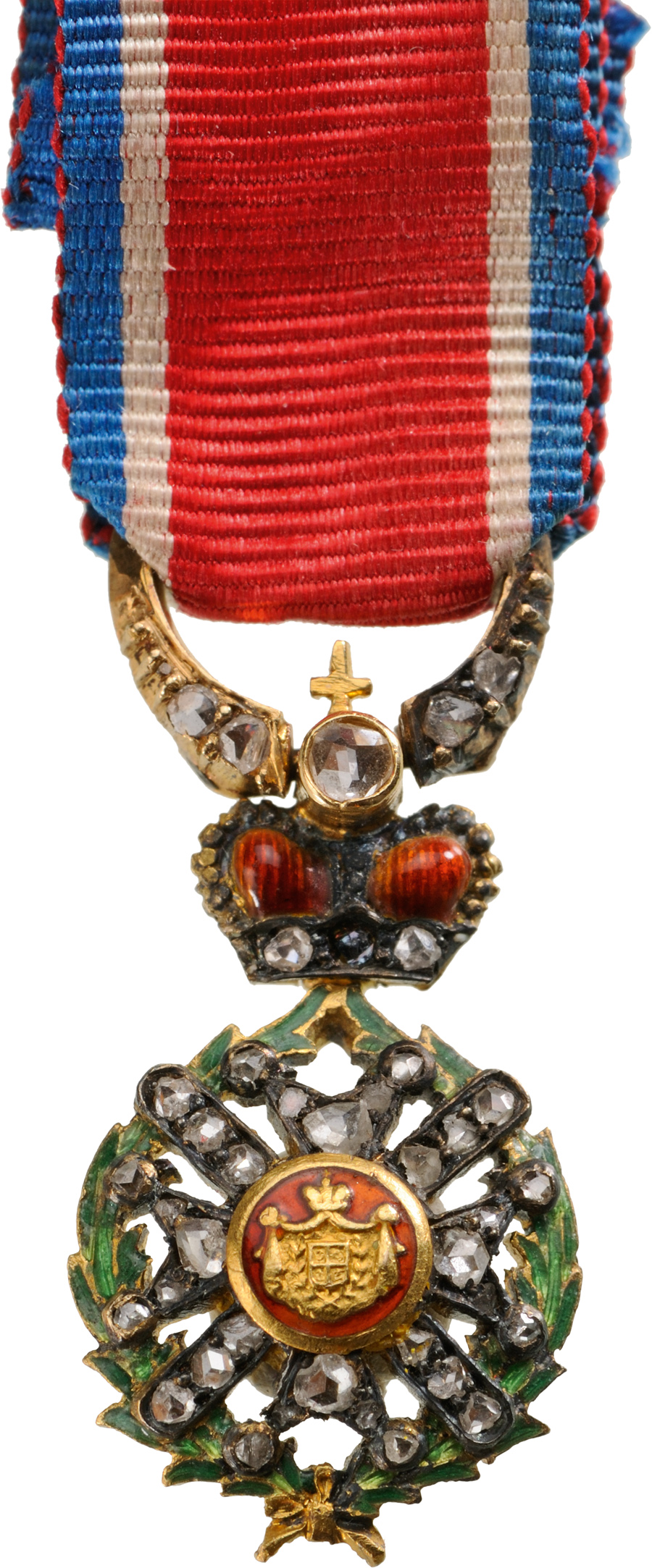 A jewelled miniature of the order in Gold and enamels; the arms, the upper orb and the suspension ring, set with tiny diamonds; original ribbon.