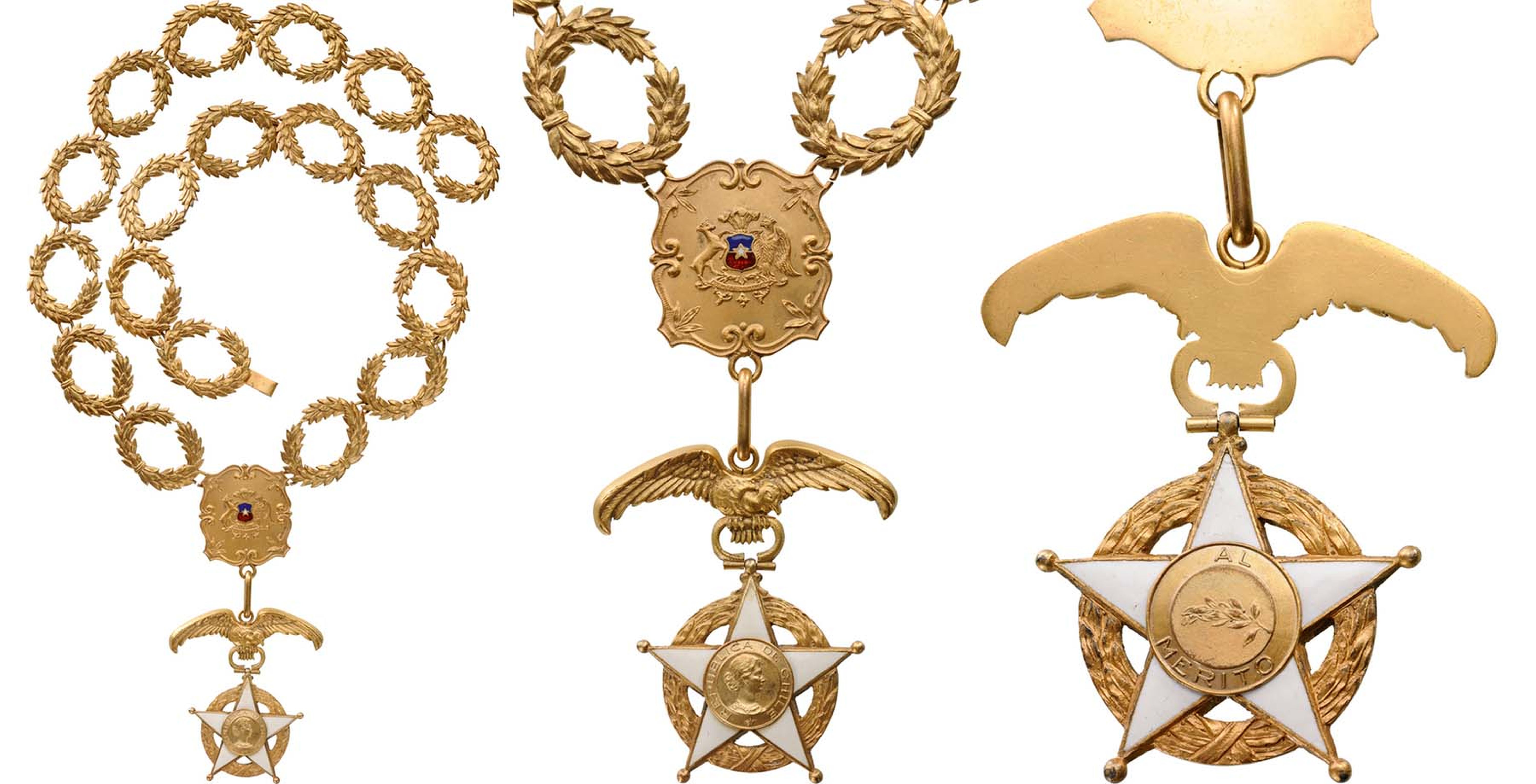 Collar of the order, instituted in 1906, in gilt Silver, composed by 18 laurel wreaths and a centre link made as an ornamented escutcheon, bearing the state`s coat-of-arms, with enameled details, the badge in gilt silver and white enamel, the suspension in the form of a Condor with spreaded wings. A beautiful, very rare collar, awarded to heads of state only, excellent condition. Dim. of the badge, 62,0 x 61,0 mm. I RR!