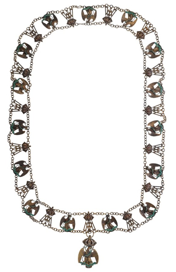 A Collar of the Order in gilt Silver, composed of 15 crowned monograms “MIM”, the crowns with enameled details and 15 “Mexican” eagles with green enameled cactus and snake, all linked by segments of chain made of oval, closed rings; the forward, centre crowned monogram with appended Order’s badge in the form of the Mexican Eagle, this, excellently chiseled and detailed, resting on green enameled cactus and holding the green enameled snake in the beak and crossed sceptres; above, the Mexican, Imperial crown with enameled details; round suspension ring, linked to the reverse of the above mentioned, crowned monogram.