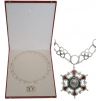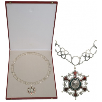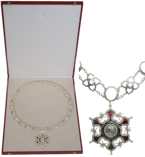 Collar of the Order, Military Division, in Silver, composed by 13 “o” links; 13 ornamental links of a moresque pattern, all connected by short sections of chain; the 13th “O” link, fitted with round loop to which the Silver Badge is appended, as a red enameled, six-pointed star of peculiar, moresque design, bordered with brilliants and flanked by the Sultanate symbol of the Jambiya dagger and crossed blades; centre medallion with embossed, calligraphic, Arab inscription, within border set with brilliants; green enameled outer circlet, bearing long calligraphic Arab inscription; smooth, concave reverse; in the original, large, red presentation case, with ivory colour, fitted inner compartment.
