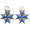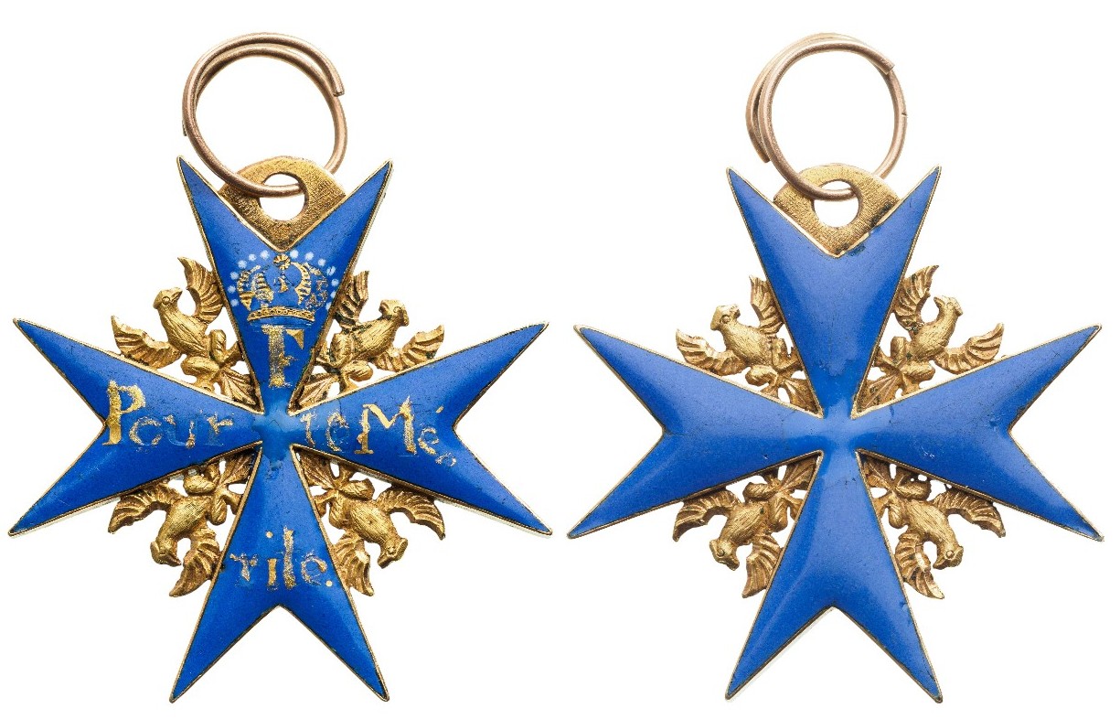 A Neck Badge of the Order in Gold: blue enameled cross of Maltese type, flanked by Prussian eagles in Gold; the upper arm, bearing the crowned monogram “F”, while the other three arms bearing the motto “POUR / LE ME / RITE” in gold foil within the enamel itself; the reverse with convex, blue enamel, upper loop drilled with a hole, fitted with the original, round suspension ring.