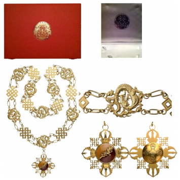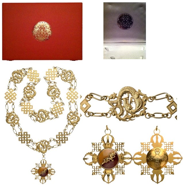 A Gilt Silver Collar of the Order composed by 8 links representing the “dorji” or crossed bolts and 8 links shaped as dragons; the badge of the order in the form of a cross, whose arms are made by 4 “dhung” (or the ritual trumpet), flanked by 4 “dorji”; obverse centre medallion enameled with Bhutan’s colours of yellow and red, with the golden dragon; reverse medallion with stylized, crossed “dhungs”, within engraved inscription “ORDER OF DRUK WANGYEl”.
