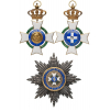 A Grand Cross set of the 1st type: Sash Badge in Gold with white enameled cross and green enameled, narrow, oak and laurel wreath; centre medallion in polished gold with head of King Otto facing right; pale-blue enameled outer circlet with the Greek inscription “OTHON KING OF THE HELLENES” in gold lettering; pale-blue enameled reverse medallion with white cross centred by the blue-white colours of Bavaria and golden inscription around; small upper loop and royal crown suspension with internal loop to secure the cross; large suspension ring and original sash ribbon; Breast Star with chiseled and pierced rays; gold centre with inner medallion of polished gold and applied, enameled cross as the badge’s reverse; pale-blue enameled outer circlet with chiseled inscription; chiseled, gold borders.