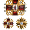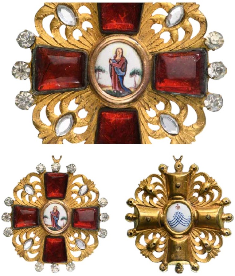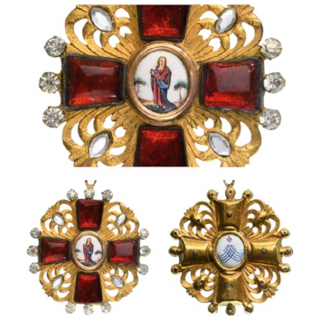 An early badge of the order in fire-gilt Bronze; the arms’ obverse, set with red pastes ending with tree white pastes each; typical ornament between the ams, centered by a set, white paste each; oval centre medallion with fine image of the saint in enamel miniature; gilt reverse, with oval, enameled centre medallion with finely painted, crowned monogram; the upper arm, fitted with round, suspension loop.