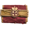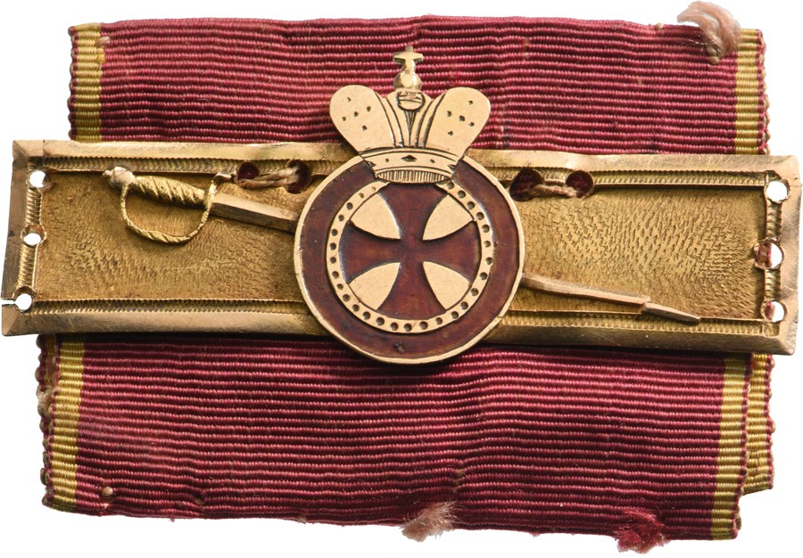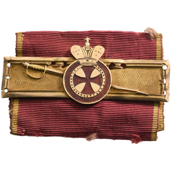 A Golden Bar of the Order, for Military Merit: rectangular with polished boder and the centre with beautifully-done “frosted” finish, each bearing the crowned Order’s merit medal in Gold and red enamel, with an obliquely-fitted “Epée”; each beneath; fitted with its original ribbon.