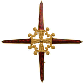 A “Swords’ Cross” in Gold; the blades with trans- lucent red enamel, showing the fine chisel-work; richly elaborated hilts with baroque crossguards and chequered grips, centered to a single, round, polished pommel; the reverese, fitted with golden pin. A beautifully-made piece, from the 1st quarter of 19th Century, excellent condition.