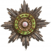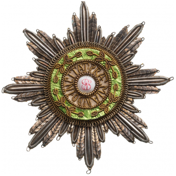 An early, embroidered Breast Star of the Order, the rays made of embossed sheet-Silver, silver sequines, bordered with twisted silver wire and tiny loops to mount the star to the habit or the uniform; white enameled centre medallion bearing the red miniature-painted monogram “SS”; white silk outer circlet bearing the gold embroidered motto “PRÆMIANDO INCITAT” bordered with twisted, gilt silver wire, the whole within broad, green lacquered sheet silver with gold embroidered, stylized laurel sprays and around, an ornamental pattern, made of silver wire; the reverse backed with strong paper.