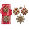 A First Class set of the Order with jewelled star; Sash Badge in Gold as a red enameled Maltese cross with ball finials, flanked by finely chiseled Russian eagles and the arms’ ends enriched by the typical “bows”; white enameled obverse centre medallion, bearing the separately-made, red enameled, golden monogram “SS”, within outer circlet with green enameled laurel wreath; the reverse with red enameled arms (very rare and seen on early badges only) and white enameled centre medallion, bearing the miniature- painted monogram “SS”, within grooved, golden outer circlet; round suspension loop struck with Russian marks, and gold-wire, original ribbon ring; with the original sash ribbon. First Class Breast Star of the Order, with chiseled silver rays, made in a pattern close to the Austrian one, white enameled centre medallion bearing the richly ornamented red enameled monogram “ss”, within golden, beaded border; white enameled outer circlet bearing the Order’s motto “PRÆMIANDO INCITAT” made of chiseled gold and thin, golden, beaded border; the whole within green enameled circlet enriched with three beautifully made groups of laurel leaves and flowers; around, a further border, set with pastes; the reverse and the vertical pin, struck with “935” silver mark and a further control mark with a tower.