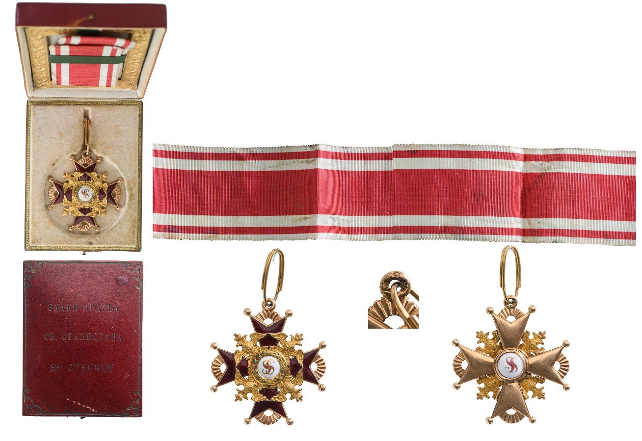 An early 19th Century 2nd Class Neck Badge of the Order in Gold, as a four-armed cross made of pink Gold, with red enamel to the obverse, flanked by yellow-gold eagles with spreaded wings; white enameled centre medallion with red, miniature-painted order’s monogram, within golden outer circlet, enriched with green enameled laurel wreath; smooth, polished reverse, with white enameled centre medallion, similar to the obverse’s one; ornamented upper loop, its ring, struck with Russian gold marks, and the date 1840; gold-wire, doubled ribbon ring and original, silk neck ribbon; in the original, red morocco case of issue with cyrillic inscrption embossed to the outer lid and fitted cream-velvet inner compartment.