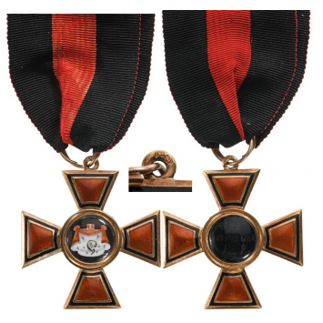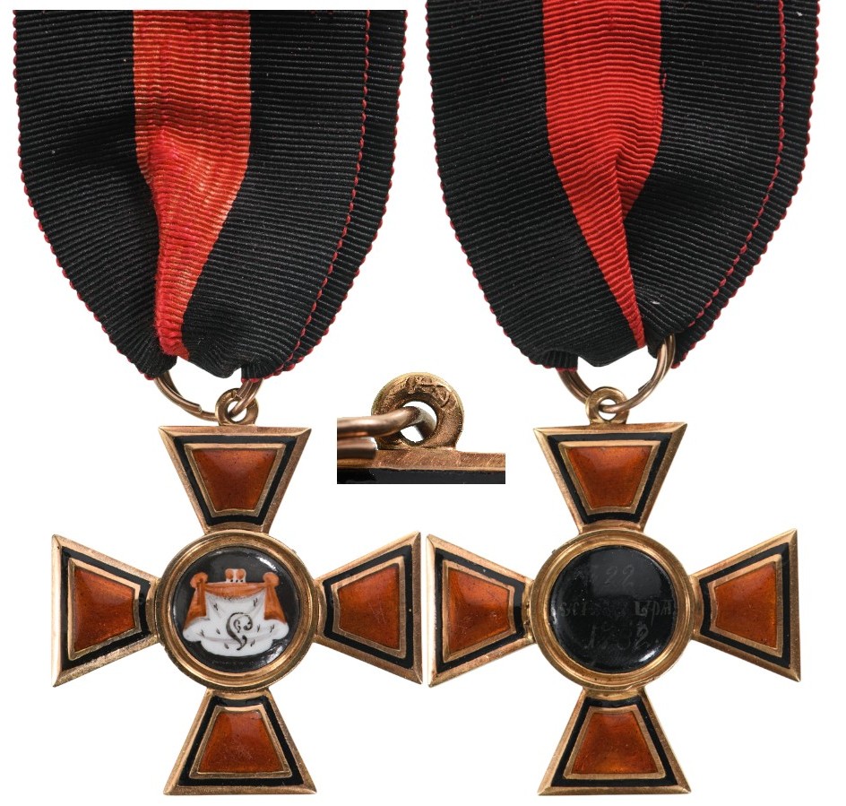 A 1st Class Cross of the Order in Gold, from the 1st half of 19th Century with bulbous, red enameled and black-filleted arms; centre medallion with finely done coat of arms of St.Vladimir in miniature enameling, within grooved, golden outer circlet; black enameled reverse centre medallion with still readable inscription, although darkened due to the natural oxydation of the thin silver foil used to make it; round loop struck with Russian mark and round suspension ring, as usual on early crosses; with original silk ribbon.