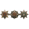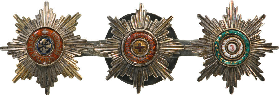 Resp. Of the Order of St. Vladimir, of St. Anne and of St. Stanislas; all with silver rays and enameled centres with gold details; all linked to the reverse and fitted with button for wear to the lapel.