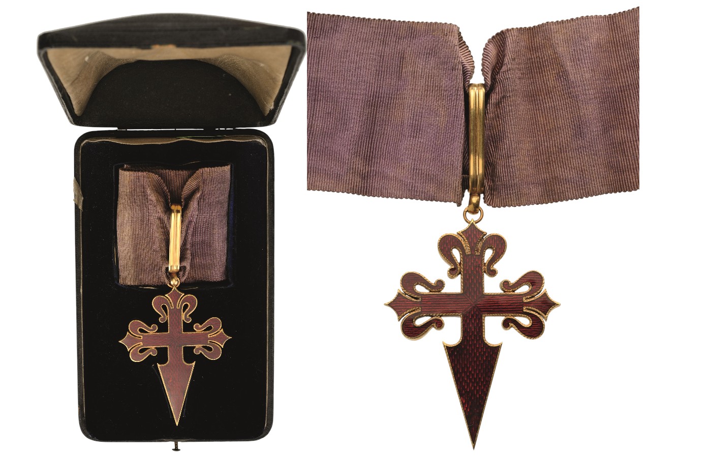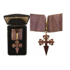 A Neck decoration of the Order: red enameled “sword” cross with excellent chisel-work under the translucent enamel on both sides; round suspension and grooved ribbon-ring; with original, purple neck ribbon with ties; in the original, black morocco fitted case of issue.