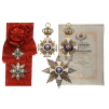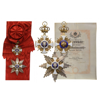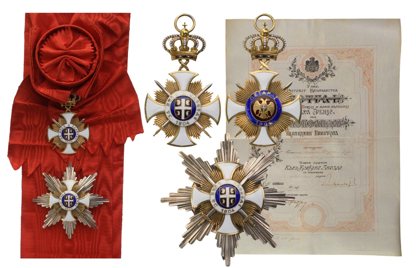 The fabulous set of 1st Class (Grand Cross) with Swords together with awarding document to General Louis Joffre: Sash badge in gilt Silver as a white enameled rounded cross flanked by bundles of thin, polished beams and crossed swords with silver “steel-like” toned blades and gilt hilts; deep-sea-blue enameled centre medallion bearing the enameled shield at the arms of Serbia (a white cross on red, flanked by fire- steels) within white enameled outer circlet with the motto “for faith and freedom 1804”, written in Serbian cyrillic script; upper loop as a double, twisted riband, connecting to the Serbian Royal crown with enameled details; round suspension ring; red enameled reverse centre medallion bearing the gilt, Serbian double eagle with enameled coat of arms charged to its breast within blue enameled outer circlet with the cyrillic inscription “PETAR I 1904”; suspended to the original, full length sash ribbon with round rosette-bow; Breast Star with polished, “concave” rays, bearing the centre similar to the sash badge’s obverse; the reverse, fitted with vertical pin; with original bestowal document, given on July 8th, 1920, signed by Aleksander, King of Yugoslavia.
