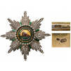 An exceptional Grand Cross Breast Star of Russian manufacture: diamond-cut chiseled and pierced rays of “Austrian” taste, flanked by green enameled short ones; gold bordered centre medallion with excellently-made miniature painting, depicting the couching lion on the background of sun, the rays, under the translucent, orange enamel, with a beautiful effect of reflexes; green enameled outer circlet with applied a thick, chiseled laurel wreath made of gold; the whole, enclosed within a circle of diamond-cut beads smooth reverse, struck with Russian silver and “G.l” master marks; vertical, tapering pin, struck with “Arnd” maker’s mark and the French, “Swan” one (for pieces passed in auction).