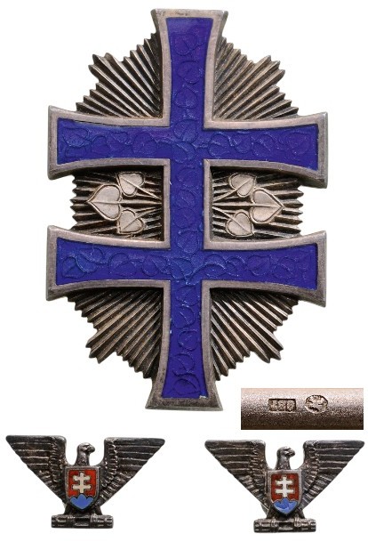 A Third Class Badge in Silver with blue enameled double cross (lime leaves visible through the translucent enamel), sided by two groups of three lime leaves each and resting on a star of thin, polished beams; smooth reverse with frosted finish, strong, vertical pin, this, struck with “987” and “K” marks; together, two screwback (the nut, missing) ribbon miniatures in silver, with enameled, Slovakian coat of arms.
