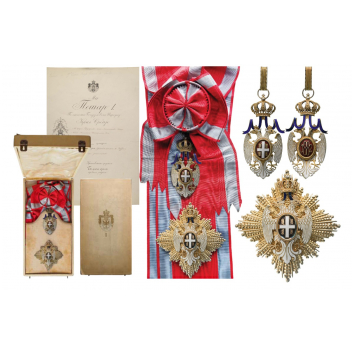 The extraordinary set of 1st Class (Grand Cross) together with awarding document to General Louis Joffre: Sash badge in gilt Silver as a white enameled double-headed eagle with red enameled, oval centre medallion bearing the gilt and enameled coat of arms of Serbia within moulded and beaded outer circlet; upper, Royal crown with long, blue enameled scrolling pendalia, link ring and broad, grooved and beaded suspension ring, the reverse with red enameled centre medallion bearing the year “1882”, within outer circlet similar to the obverse from which two prongs depart to reinforce the suspension to the crown’s pendalia; fitted with original, full-length sash ribbon; Breast Star in gilt Silver with polished and chiseled rays, the centre as the sash badge’s obverse, but smaller, with elegantly chiseled and engraved details, the reverse, fitted with vertical pin; the whole, in its original, off-white case of issue, the lid with gold embossed coat of arms and indication of the class and fitted, inner compartment; with original award document to Louis Joffre as Général de Division and French Chief of Staff, dated in Belgrade on March 5th, 1912, with original signature of King Peter and of the Chancellor of the Royal Serbian Orders.
