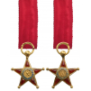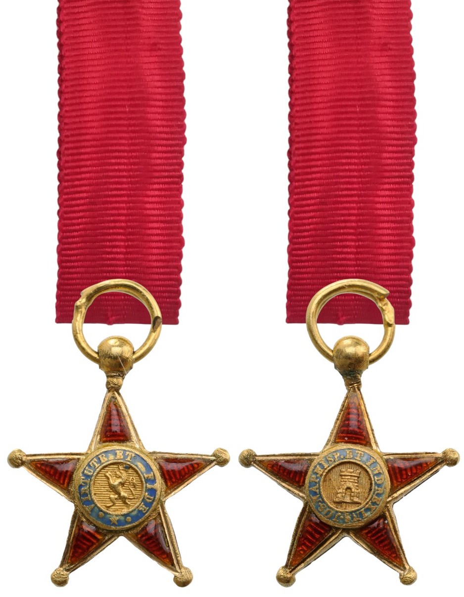 A miniature of the order in Gold: red enameled, five-pointed star with ball finials; obverse centre medallion with the tower of Castille, within blue enameled outer circlet with golden inscription « JOS. NAP. HISP. ET. IND. REX LVS. »; reverse medallion with the lion of Leon, within blue enameled outer circlet bearing the motto « VIRTUDE ET FIDE »; upper, sphaerical loop and smooth, round ribbon ring, this, struck with a mark, original ribbon.