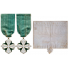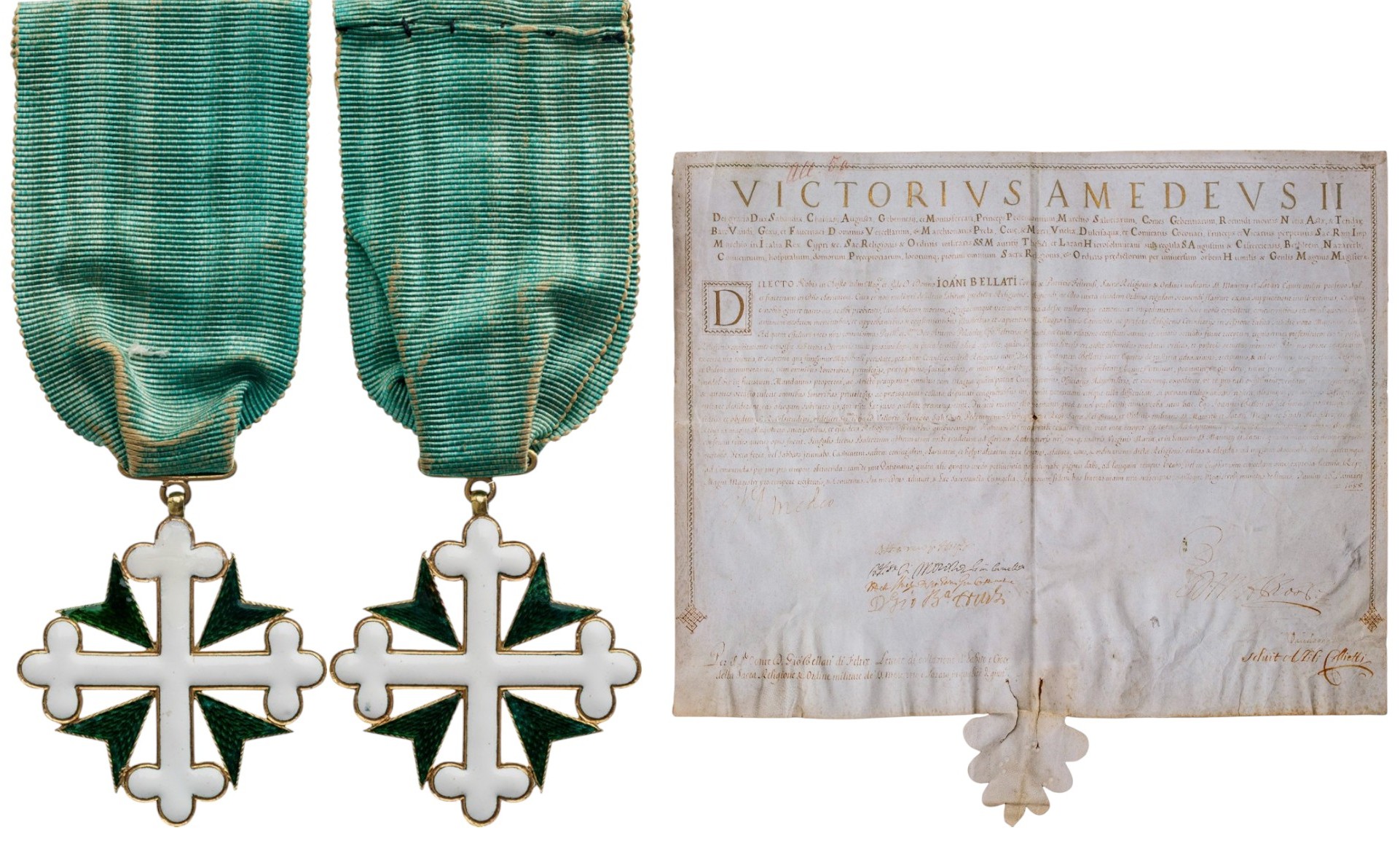 A very early group to a Knight of the Order: Cross in gold with slightly, homogeneously convex white enameled cross of St. Maurice, with narrow, concave, chiseled border, flanked by the green enameled cross of St. Lazarus, with fine chiselwork visible under the enamel’s translucence; small loop to the upper arm, to which a short, horizontal suspension ring fitted with link is mounted; with very old, sewn, now faded silk ribbon; together, its Award Patent, parchment with gold-illuminated heading, border and the recipient’s name, completely written in neat chancelry calligraphy and given in Turin, on January 26th, 1688, to the Count Giovanni Bellati and bearing the autographed signature “V. Amedeo” (Victor Amadeus II 16661732), Duke of Savoy and the signatures of the members of the Order’s Chancellery; the document indicates that the letters were accompanied by the habit and the Cross of the Order; the lower border, cut as a downwardly pointing, stylized palmette or acanthus leaf, with two vertical, cut slits where once was the lace to keep the parchment rolled, and the wax seal to keep it closed until opened by the recipient.