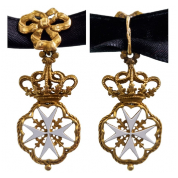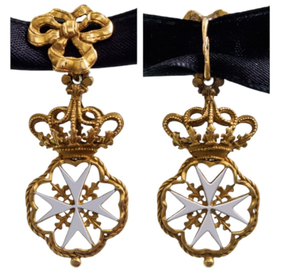 A Knight’s Cross of the Order in Gold with white enameled arms, flanked by fleurs de lys, enclosed in an elaborate frame of artistically bent and twisted gold wire, ending with a small sphaerical appendant below; on top, the typical lilied crown with suspension loop as a stylized rosette; ribbon ring with riveted ends, enriched by a beautifully formed, embossed bow with chiseled details; with black, silk ribbon.