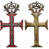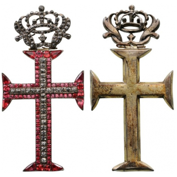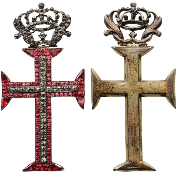 An early 19th Century Badge of the Order: Gilt-Silver cross, set with rose-red and white pastes; smooth reverse; hinged suspension, made as a stylized, royal crown, also set with small, brilliant-cut, white stones; the reverse, with curved suspension ring (this, struck with a rabbit’s head mark).