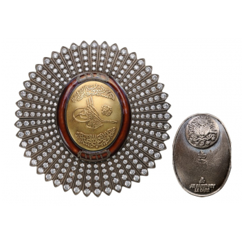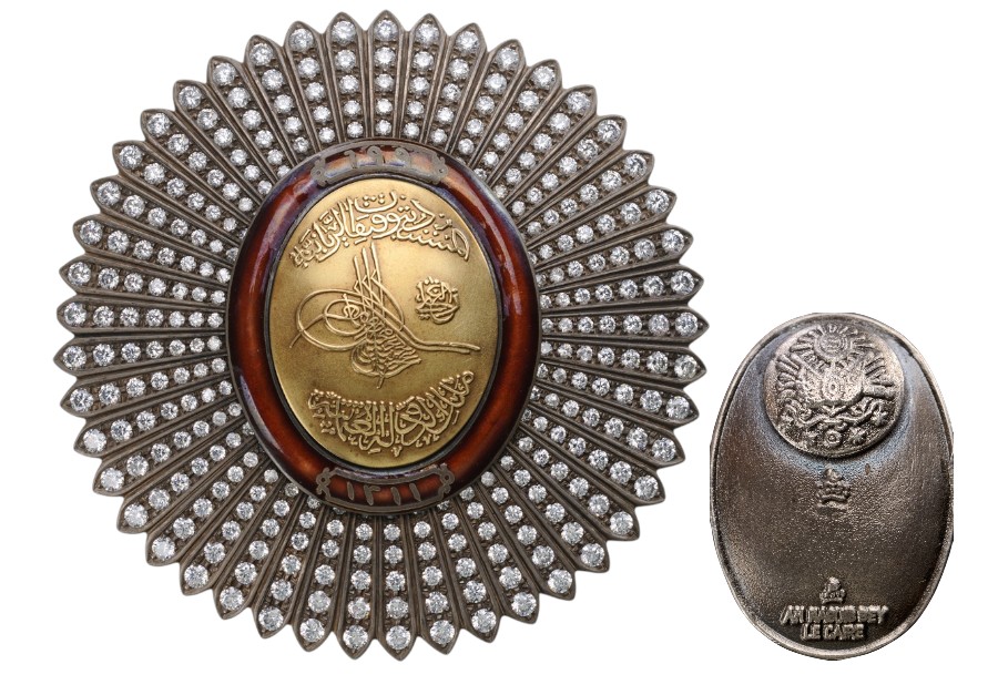 Silver Star of slightly oval form with dagger-shaped rays, all profusely set with brilliants; centre medallion in gold embossed with the Sultan’s Mahmud II (17841839) Tughra and inscriptions on polished ground within red enameled outer circlet, also bearing inscriptions in Arabic calligraphy; mirror-polished reverse with convex, round counter-medallion this, bearing a further, oval escutcheon with the Ottoman Imperial coat-of-arms, a mark and the maker’s mark of Ah. Neguib Bey, Cairo (court jewelers to the King of Egypt), fitted with vertical pin.