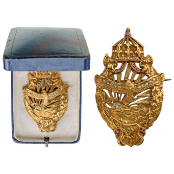 Made of solid Gold: laurel and oak wreath enclosing an eagle with spreaded wings (these, set with six brilliants each), flying on a landscape with the beaming rising sun, enriched with brilliants; Bulgaria’s Royal Crown, its pendalia and orb, set with rubies; escutcheon bearing the lion rampant below, flanked by ruby-set ribands; the reverse, fitted with horizontal pin.