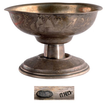 Engraving of pears, apples and grain, dedication on 1856 on the base "For my niece Mila, forever, your uncle Slav (ik)", height 7.5 cm, weight 150 g, "84" standard guarantee (875/1000), St. Petersburg 19081926, silversmith "PIO" probably the successor of Ilia Olovianishnikov.
