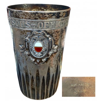 Silver timpani, souvenir from Military School, truncated model with grooves and nice decorated enamelled applique medallion, attributive frieze engraved "Society of non-commissioned officers". Lausanne, Switzerland, 20th century work around 1910 by the silversmith Auguste Haldy (workshop disappeared in June 1923). Guarantee hallmark 800 & makers's mark . Good general condition. Height 7,5 cm, weight 50 g.