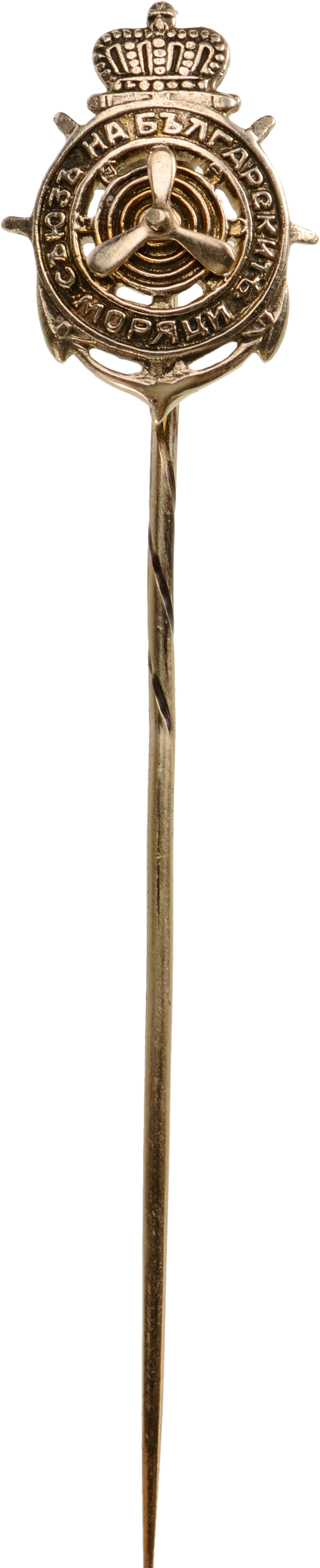 Ship’s thruster within round scroll bearing cyrillic inscription, 24x21 mm., resting on a rudder wheel and a vertical, “admiralty”-type anchor, Royal crown on top, fitted with vertical pin.