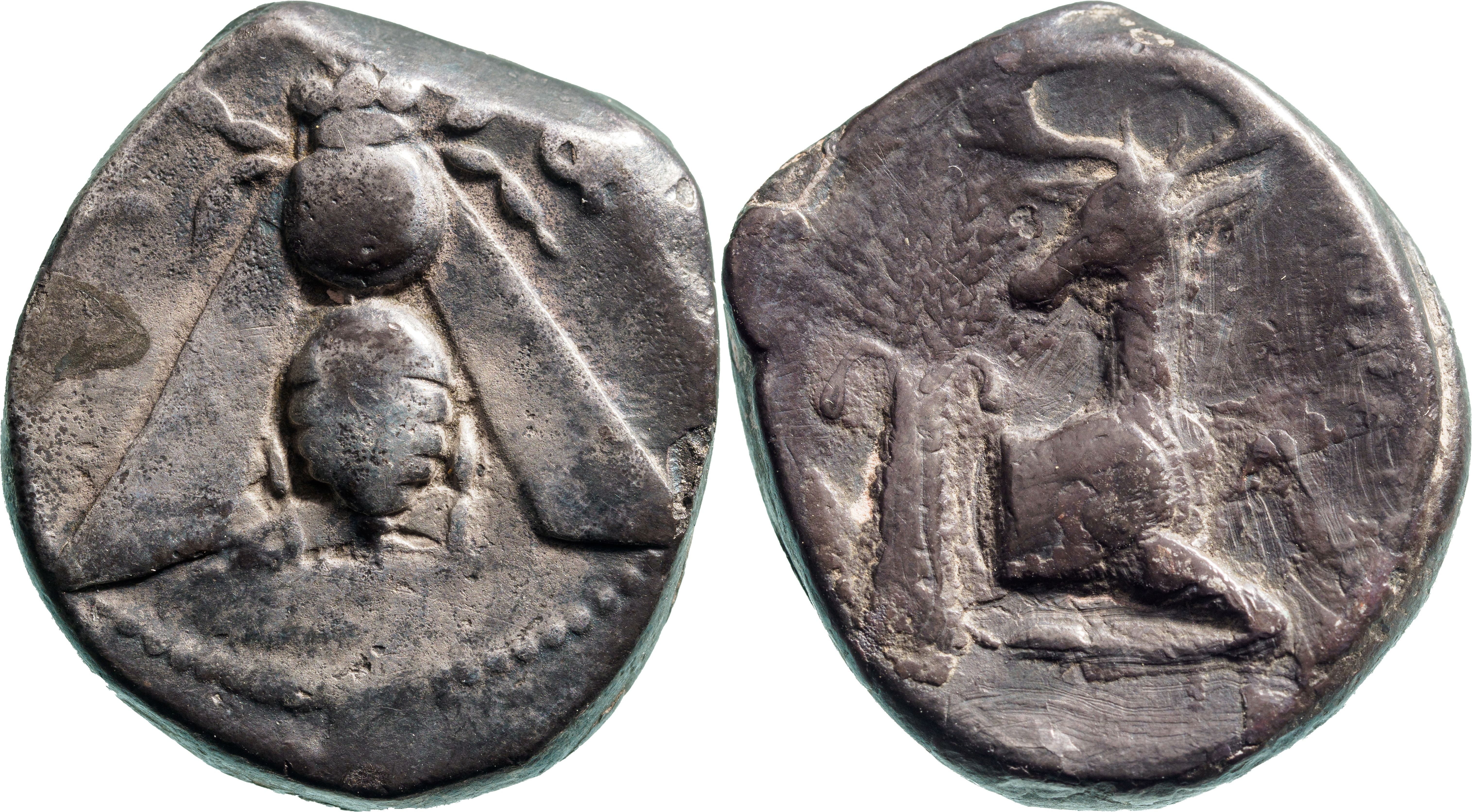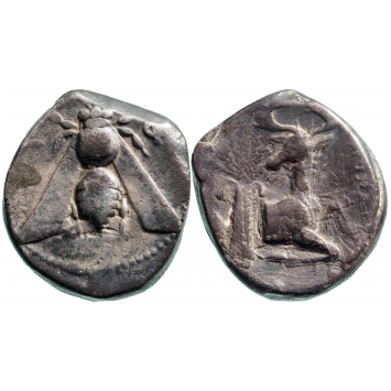 E-Φ Bee with bent wings/ (ΑΡΙΣΤΟΛΟΧΟΣ) Forepart of a stag to right, head turned back to left; behind to left, palm tree with two date clusters. SNG Copenhagen -. SNG Fitzwilliam 441. VF+