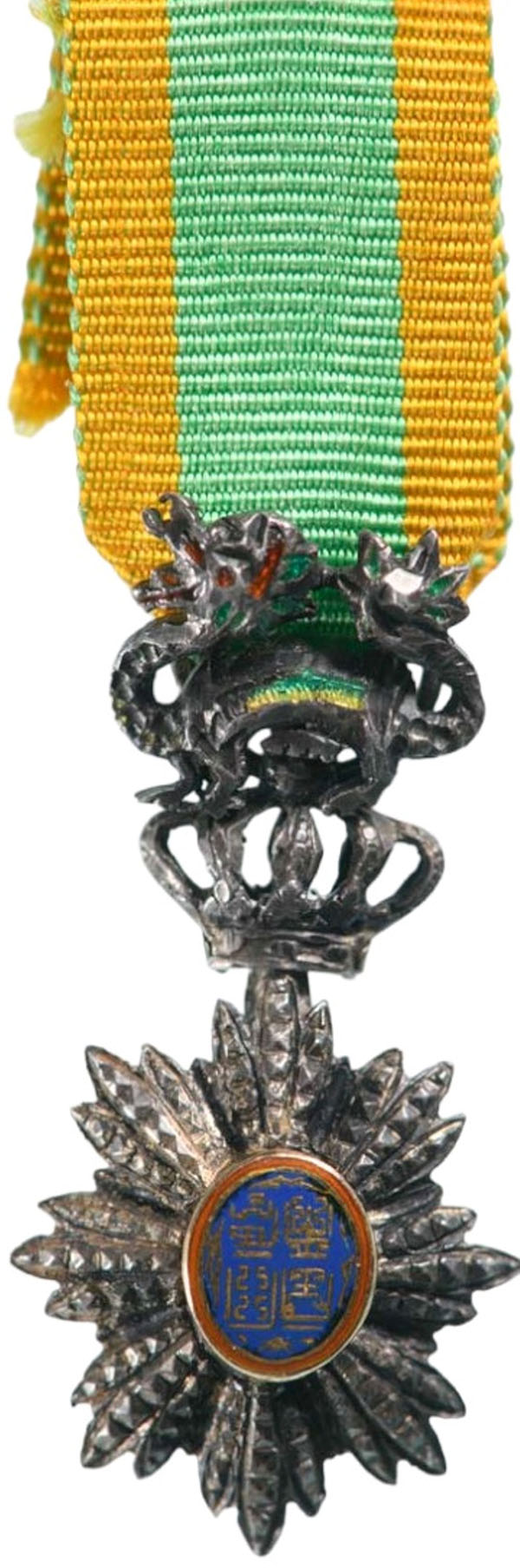 Knight's Cross Miniature, 5th Class, instituted in 1886. Breast Badge, 29x14 mm., Silver, brilliant cut rays, central medallion enameled, original suspension device, ring and ribbon. An extremely fine miniature, in superb conditionI
