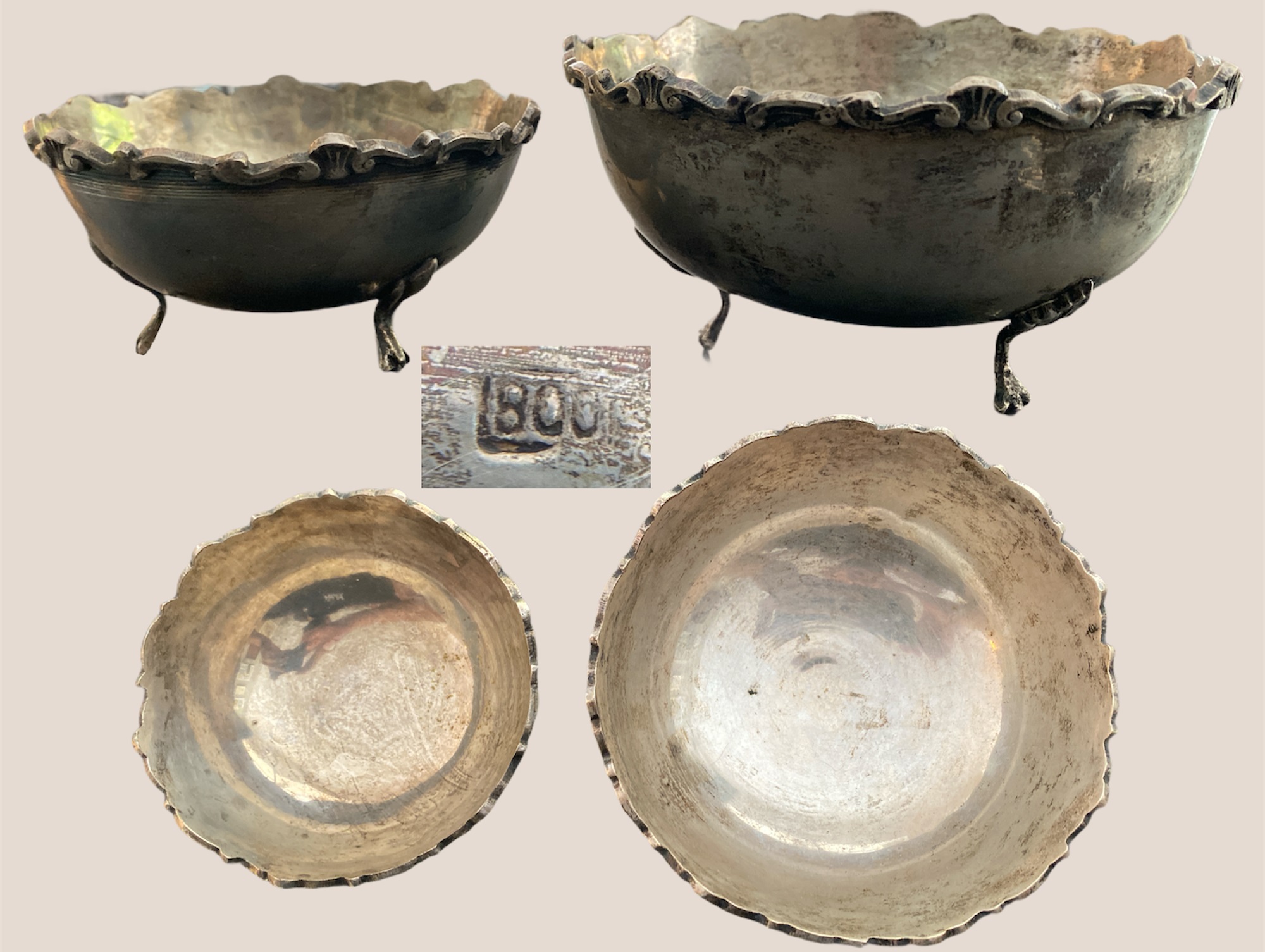 Lot composed of two silver table cups (probably finger wash), tripod model with molded border adorned with a shell gallery. Guarantee mark 800, total weight (2 pieces) 244 g, height 6,7 & 5,2 cm, diameter 13,5 & 10,5 cm. Good condition.