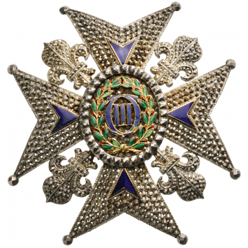 Numerary Commander`s Breast Star, 65x61 mm, diamond-cut chiseled Silver cross flanked by fleurs-de-lys, the arms with blue enameled gold details, oval centre medallion with the blue enameled monogram "C" within a green enameled laurel wreath, diamond-cut chiseled silver outer circlet, gilt reverse with convex counter-medallion, vertical, round pin (French mark). An attractive star of slightly reduced size, from the mid 19th Century,extremely fine condition, very rare! I RR!