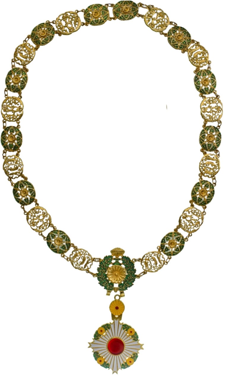 Collar Chain and Collar Badge, instituted in 1888. Badge, gilt Bronze, 82x58 mm, both sides enameled, four-pointed star of white enameled, swallow‚Äö`s tailed beams, flanked by orange-yellow enameled, stylized chrysantemum flowers, between green enameled foliage; translucent-red enamel centre, representing Japan‚Äö`s symbol of the rising sun; hinged suspension also in the form of an enameled chrysantemum flower, the reverse identical to the obverse, but the suspension, with japanese inscription on orange-yellow enamel; suspension ring. The Chain,76 cm., gilt Bronze, one side enameled, 25 medallions.