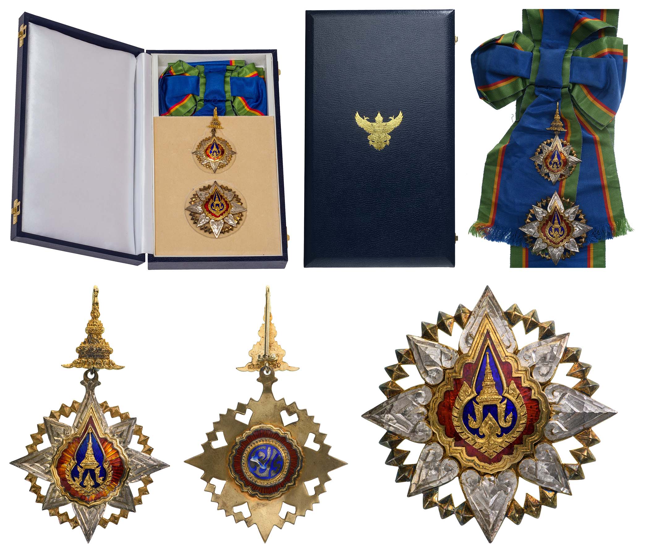 Grand Cross Set of the Order. Sash Badge, 92x58 mm., partially gilt Silver, maker's mark, enameled, suspension in the form of the Thai crown, with original, longt sash. Breast Star, 79 mm., gilt Silver, with chiseled and pierced arms, alternated by polished, golden beams, the centre, as the badge`s obverse, the reverse, fitted with vertical pin, in the original, case of issue, the lid with gilt Thai divinity and fitted, inner compartment. A beautifully-made set, in excellent condition. I