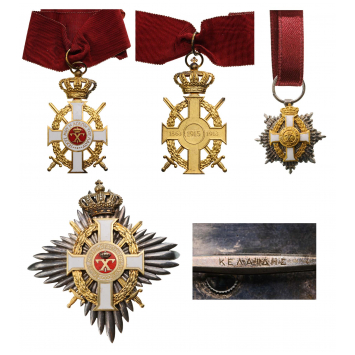 Grand Commander`s Set with Swords. Neck Badge, 83x47 mm, in gilt Silver and white enameled cross with a gilt laurel wreath and crossed swords between the arms, centre medallion with red enameled detail and an applied, royal crown, granulated reverse, with the date "1915" sided by the further two dates "1863" and "1913", original neck ribbon with ties, 4-pointed Breast Star, 76x72 mm, with smooth silver rays, superimposed with the order`s badge with swords in gilt silver, the reverse with vertical, broad pin (struck with a Greek maker`s mark) and two hooks. A very rare and very fine group. I RR!
