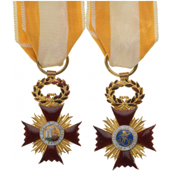Knight`s Cross, 5th Class, 1st Model, instituted in 1815. Breast Badge, 44 x 28 mm, gilt Bronze, superimposed parts gilt enameled, both central medallions gilt, enameled, original suspension wreath, ring and ribbon. Rare and superb! I R!