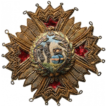 Early, embroidered Breast Star, 86 mm, Gold wire and paillettes, the cross’s arms made of red-lacquered metal foil, polychrome, convex centre, the points, with tiny loops to mount the star, paper backing to the reverse. Rare and in very fine condition, slight darkening due to age. II R!